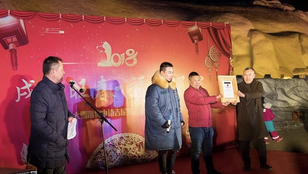 该雪雕以生肖“狗”为题,采用人工造雪堆积雪坯,尺寸为119.65×55.66×17.94米,沈阳雪冰艺术雕塑有限公司组织百余位雪雕技师为“2018沈阳国际冰雪节主会场棋盘山冰雪大世界”手工雕刻而成。2018年2月1日至3月4日展于沈阳市棋盘山风景区内。