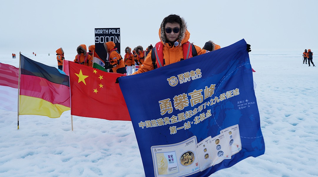 2025年7月27日由北京百福金业文化发展有限公司主办的中国熊猫贵金属纪念币7+2九极征途·全球七大洲最高峰及南北两极点展示活动在北极点举行,此次活动从北京出发抵达北极点。北京百福金业文化发展有限公司总裁栾来春现场展示熊猫金币系列产品,包括“传世国宝”、“连中三元”、“勇攀世界之巅”荣耀勋章。